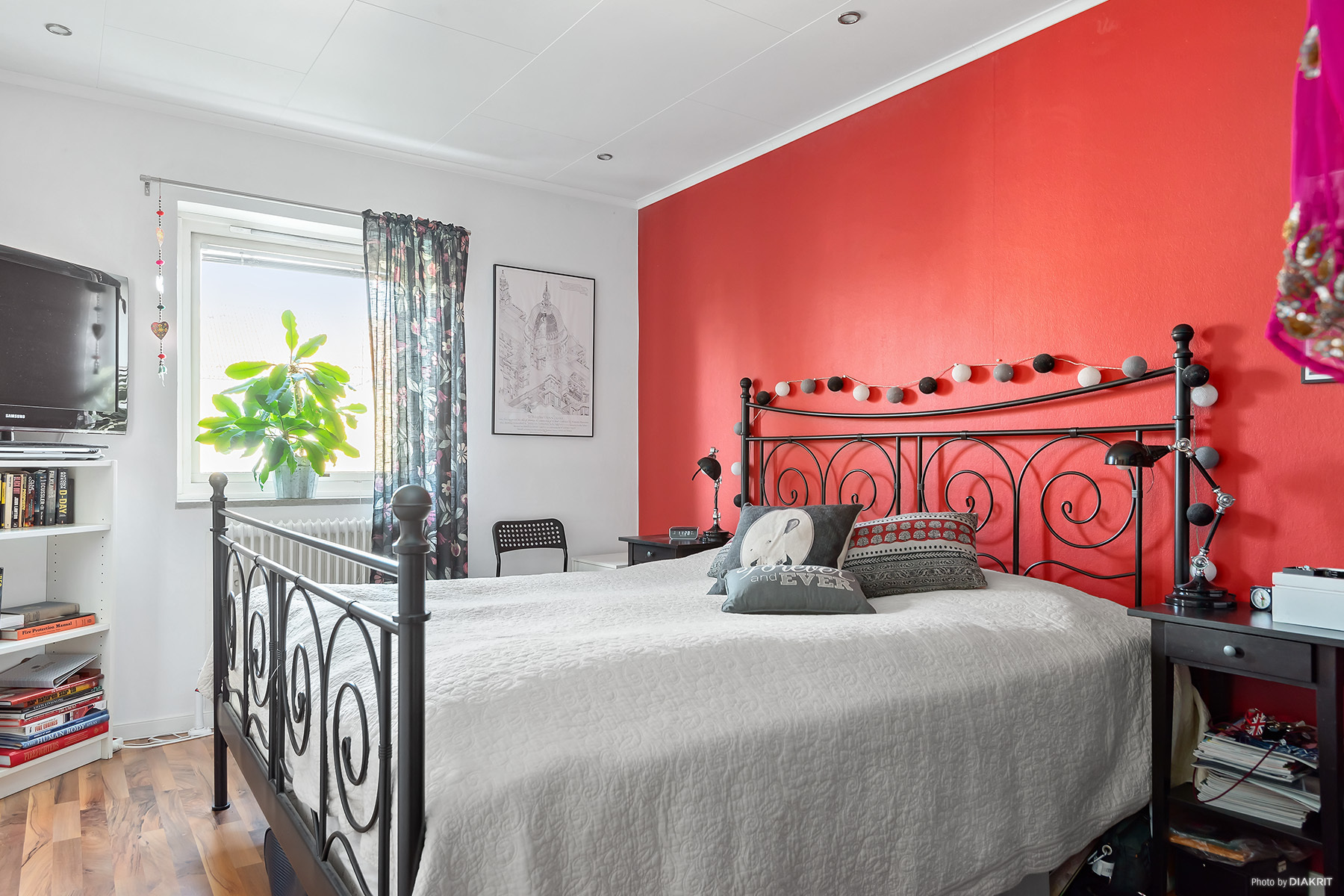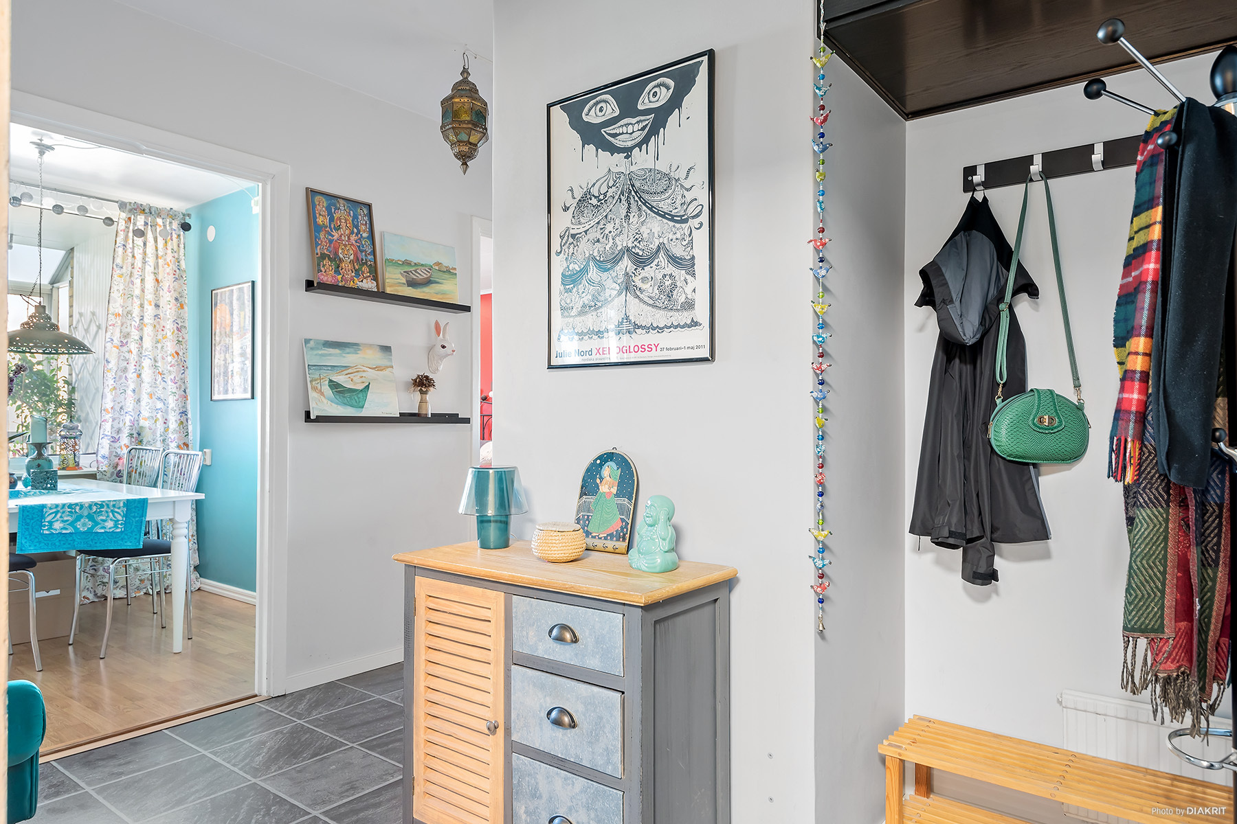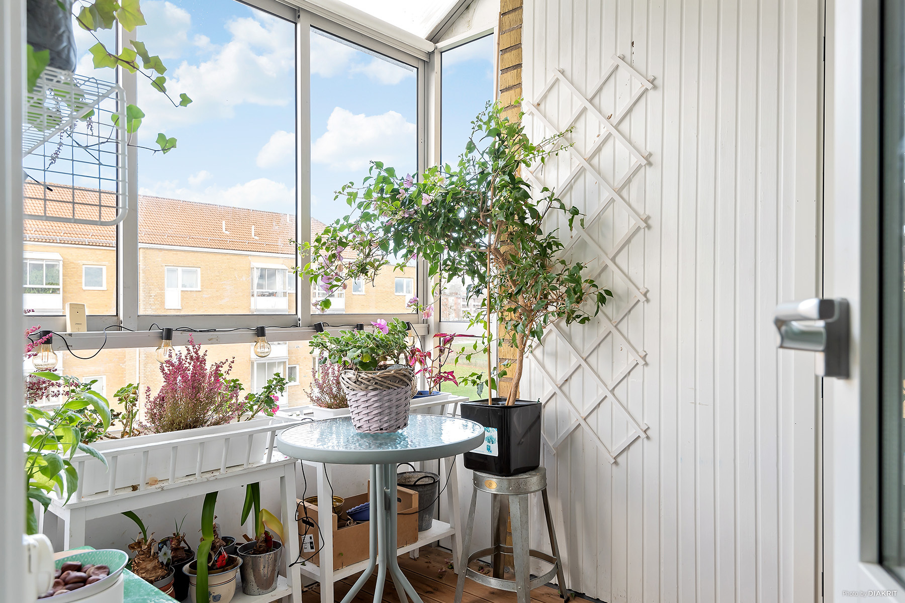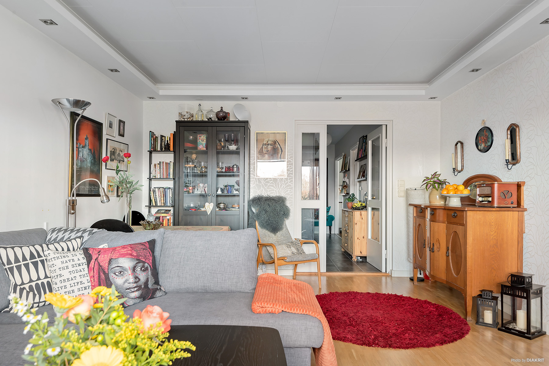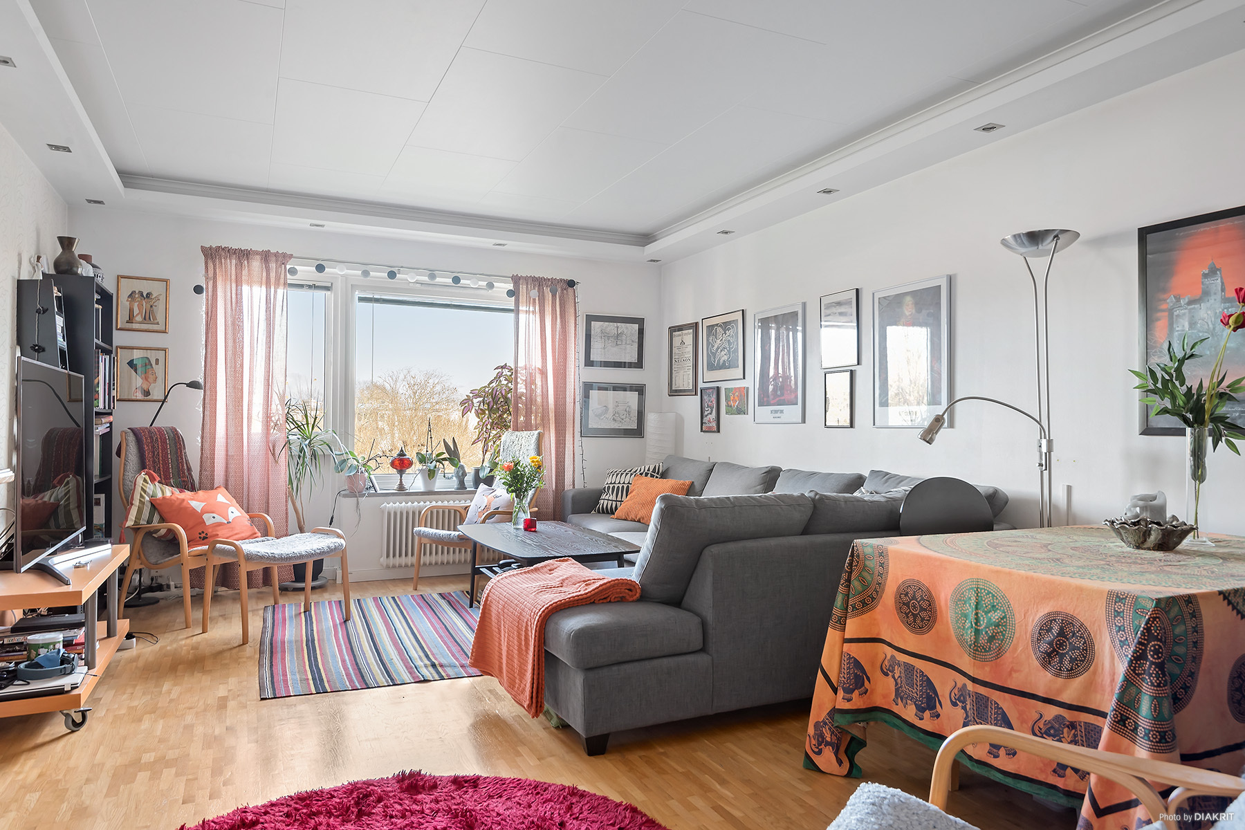 Här finns en lägenhet högst upp i huset med en härlig och fri vy. En varm och välkomnade hall med bra avhängningsmöjligheter. I hallen ligger ett klinkerinspirerat laminatgolv. Genomgående ljus lägenhet. Köket har skåpsluckor i offwhite och är i behov av uppfräschning. Matchade bänkskiva i ek. Köket har en rostfri maskinpark med kyl/frys, diskmaskin, häll och ugn. Härligt ljusinsläpp från fönstret där ett köksbord får sin naturliga plats. Från köket når du den inglasade balkongen i sydvästläge. Badrummet är helkaklat med vita kakelplattor på väggarna och mörkgråa plattor på golvet. Vitt porslin, toalett, handfat med förvaring och dusch. Lägenheten har två stora sovrum där både sängar, sängmöbler och skrivbord får plats. Sovrum 1 har idag en fondvägg i rött, utgång till balkongen finns även här. I hallen hittar du även separat tvättstuga med både förvaring och handfat. Det finns även ett separat garderobsutrymme med gott om plats till förvaring. Sovrum 2 är ännu större och med ljusa väggar samt fondvägg. Lägenhetens mittpunkt, vardagsrummet, ger många valmöjligheter i möblering. Fantastiskt ljus från fönsterna och många väggar att jobba med möblemang emot. Här finns det även plats för ett matsalsbord om så önskas. I taket finns det även spotlights. En lägenhet som bör upplevas på plats, välkommen att boka visning!